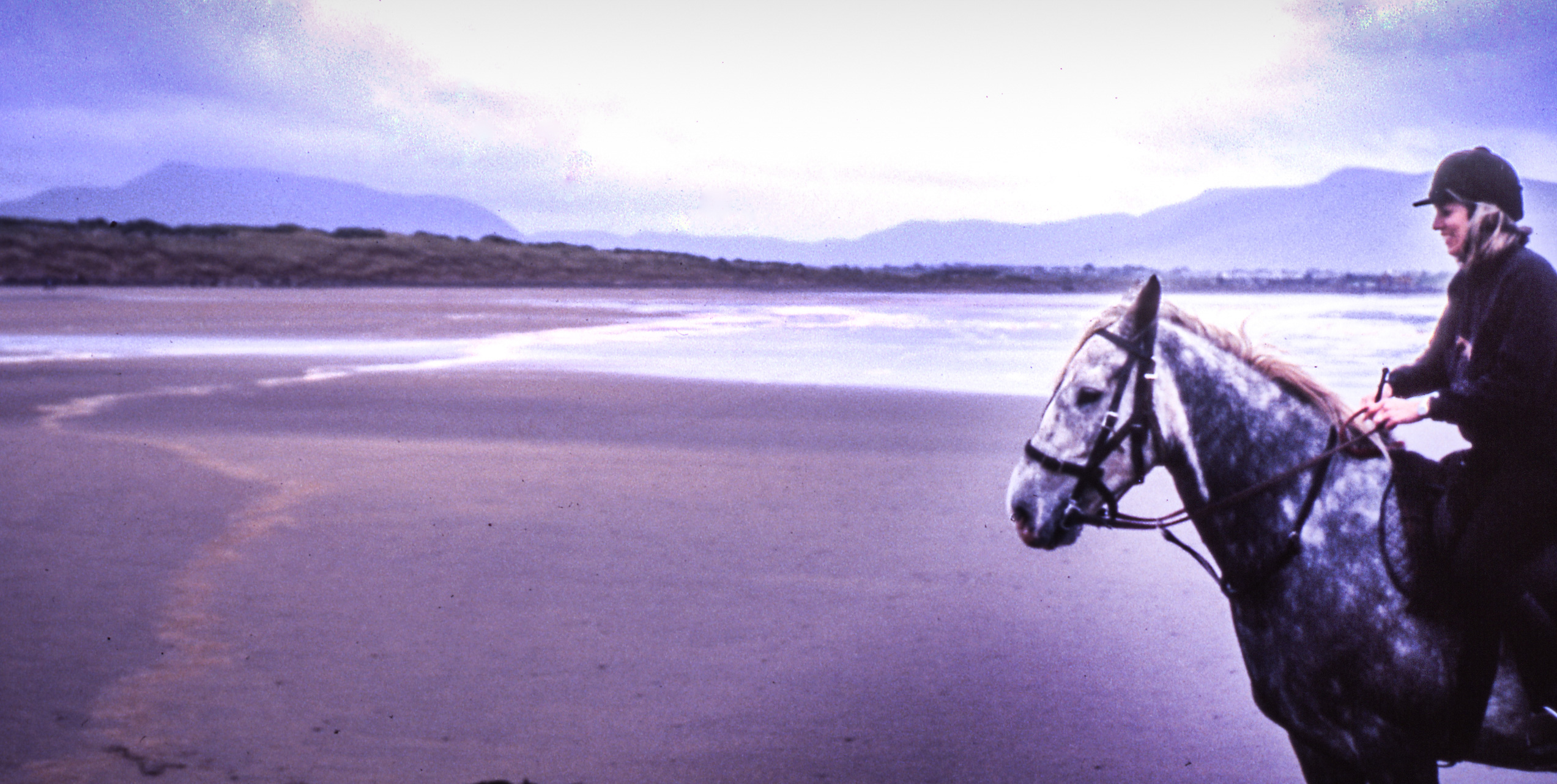 Each portion of the trip brings unexpected challenges and pleasures. From our sojourn at Kinnitty, we drive to Killarney, where we meet stable master Donie O’Sullivan, who will lead the longest ride of our trip, a trot to Waterville, where we take vigorous canters on the beach between intermittent rain showers. At midday, our caravan clip-clops into the village of Waterville in a driving rainstorm. We shelter and tie the horses, gentle, strong Connemara ponies, to a rail behind the town pub and wait out the storm with hot toddies, fish, and chips.